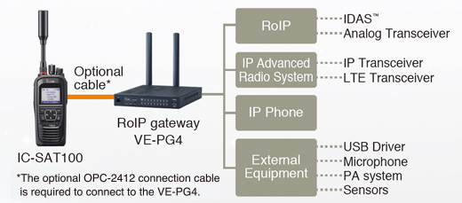 Với cổng RoIP VE-PG4, IC-SAT100 có thể kết nối với điện thoại IP, IP, LTE, IDAS kỹ thuật số* và bộ thu phát analog.