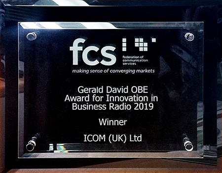 Icom đã giành được Giải thưởng Gerald David của Liên đoàn Dịch vụ Truyền thông (FCS) 2019 cho Giải thưởng Sáng tạo trong bộ đàm Kinh doanh cho Giải pháp Radio PTT Vệ tinh IC-SAT100. Giải thưởng đã được trao tại Bữa tiệc Gala Business Business diễn ra tại khách sạn Chateau Impney gần Droitwich sau hội nghị thường niên của tổ chức. Giải thưởng Gerald David cho Đổi mới trong bộ đàm kinh doanh ra đời vào năm 2004 và công nhận sự đổi mới trong ngành phát thanh kinh doanh.